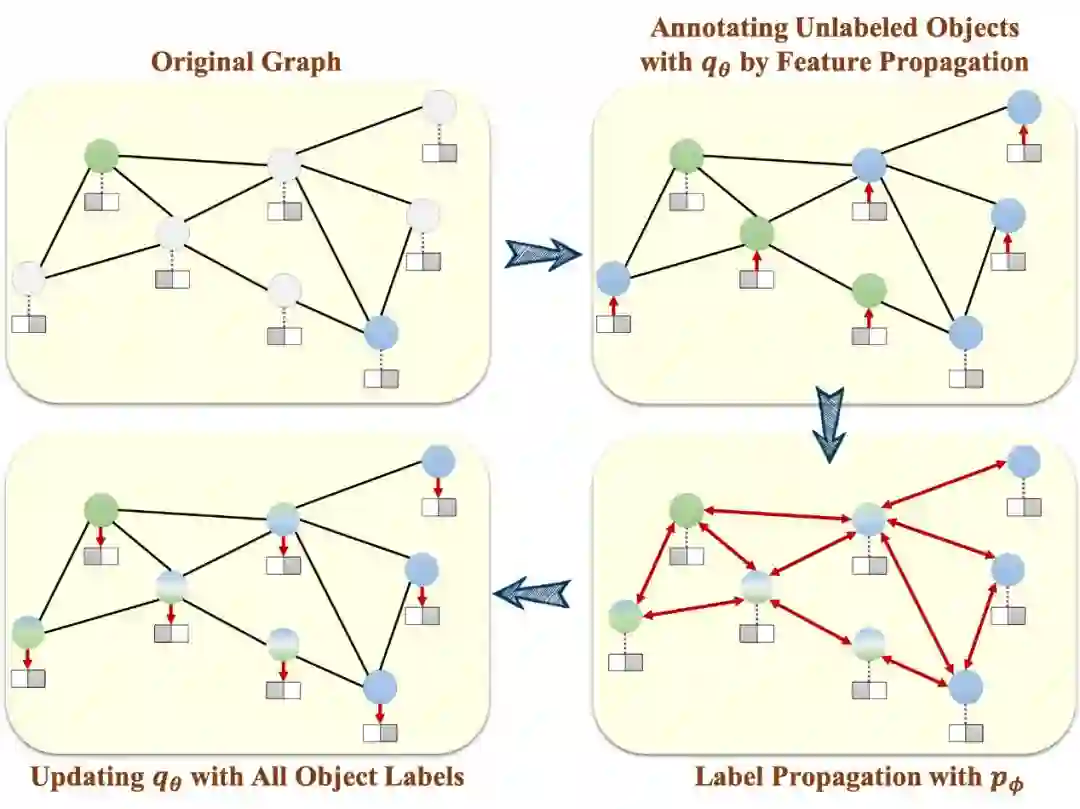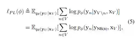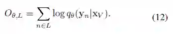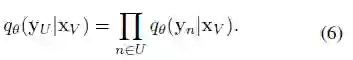 可以理解用变分的方法,不断减小q与真实的后验分布之间的KL散度,使得q不断逼近真实的后验分布(式11),同时由于部分已知标签的存在,因此该部分结点标签的概率分布直接使用真实值即可(式12)。