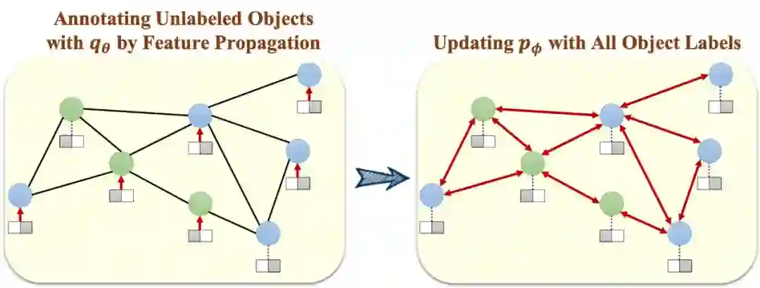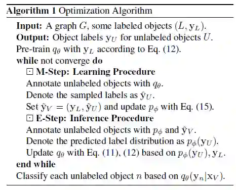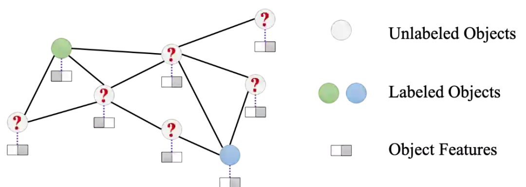 弱监督下的在关系数据中的对象分类。形式化地来说,给定一个图G,图上有结点V表示一系列对象,在对象间存在有一系列边E,且每个结点都有对应的属性XV。当前已知部分结点L的标签,目的是推测出剩余结点U的标签值。