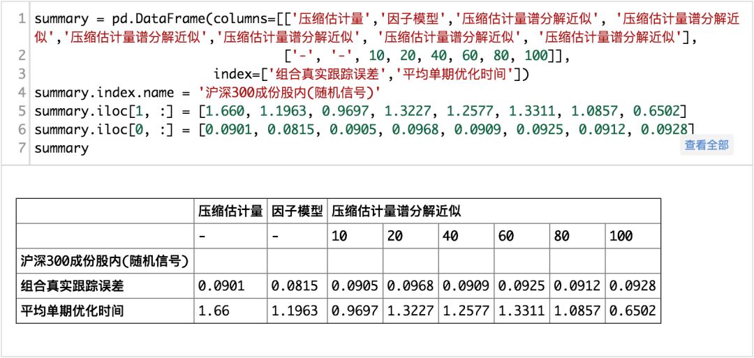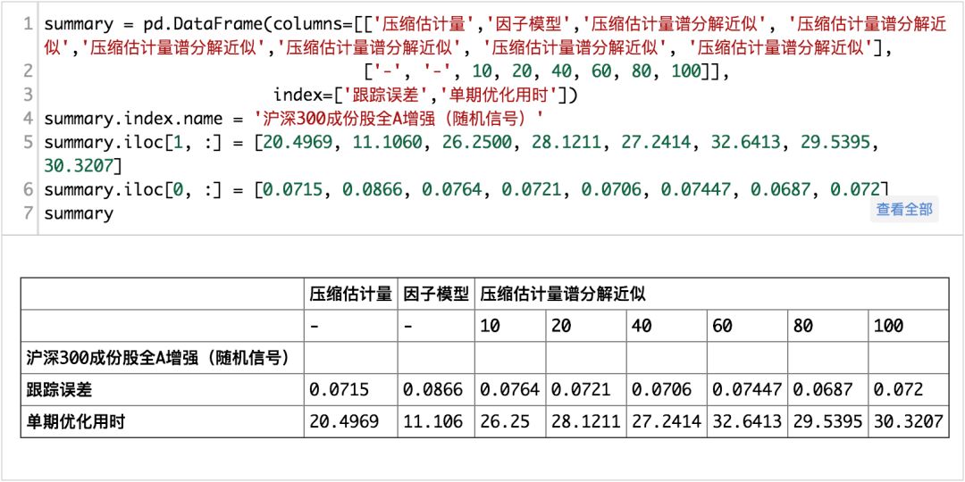 为了避免其它约束对风险预测的影响,我们只设置跟踪误差约束,以及个股权重的上限,λ设为0.05。我们比较组合实际的跟踪误差与预先设置的跟踪误差的差别。同时为了检验我们模型对风险的预测能力,我们使用随机的组合来进行测试。再把这些结果,输入到优化器内进行求解,得到权重之后,使用优矿最新的quartz回测框架进行测试(新版回测速度很快,大家多多使用,多提建议啊),回测的模板将在附录当中给出。下表给出了统计结果(求解时间包括数据载入的时间,实际上,在问题维度较大的情况下,我们本地测试下来,我们的优化器的性能要显著优于cvxpy+ecos)