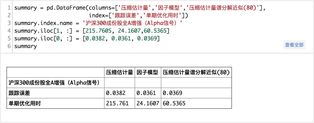 从真实的信号测试的结果来看,在全A范围内使用压缩估计所耗费得到的协方差矩阵进行组合优化所求解的时间明显要多于基本面风险模型和,而压缩矩估计+主成份分解的方法次之,基本面风险模型是最快的而且也是效果最好的,而在沪深300成分股内,则不明显。整体上来说,使用压缩矩估计+主成分分解来估计协方差矩阵是可行的。