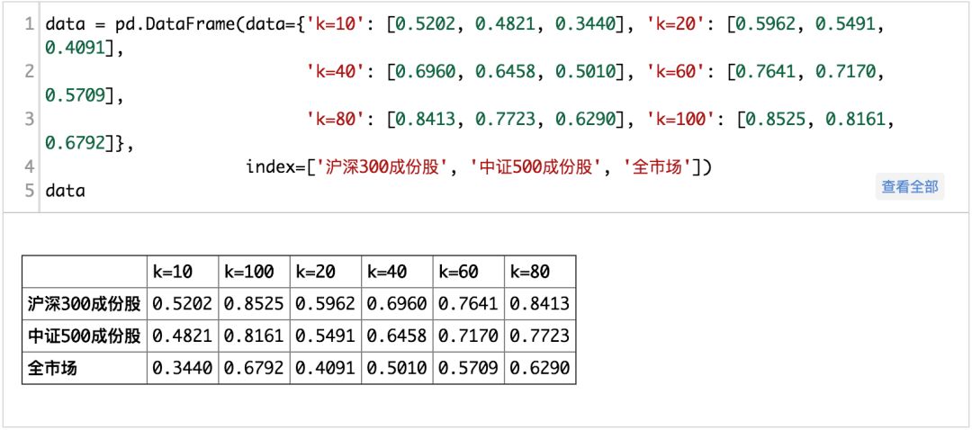 从上表的结果来看,对于沪深300成份股、中证500成份股前20个最大特征值之和占比就超过了50%;当k取100时,沪深300成分股超过了80%,但是中证500成份股依然没有达到80%,并且对于全市场来说,k取100方差解释度不足70%。