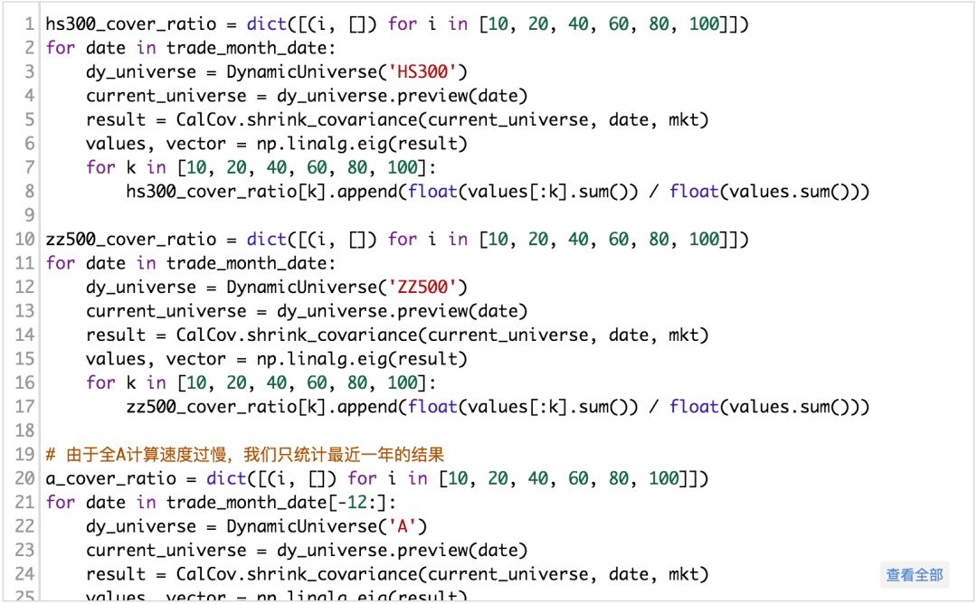 事实上,统计风险模型好比是使用了统计学上的因子分析法,甚至更具体的是因子分析当中的主成份法。在前文当中,我们也留下来这样一个思考,保留的公共因子的个数k取多少合适?这里,我们使用主成份分析中的方差解释度这个概念,计算前k个最大的特征值之和占所有特征值之和的比例。