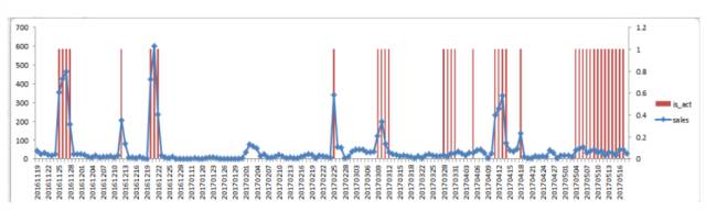 对促销、流量等数据进行分析,抽取与销量波动相关的特征变量,将不同的特征变量带入同一有效的模型逐步验证特征变量的有效性;再将相同的特征变量应用到不同的模型中以测试不同模型的效果,并选择效果最佳的特征变量和模型作为销量预测模型。例如:我们选取了一些典型的SKU,对其促销活动数据和发货量数据作分析,发现发货量的异常波动和促销活动之间有极大的相关性。