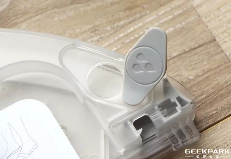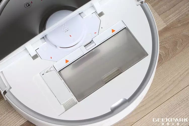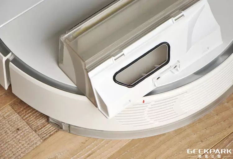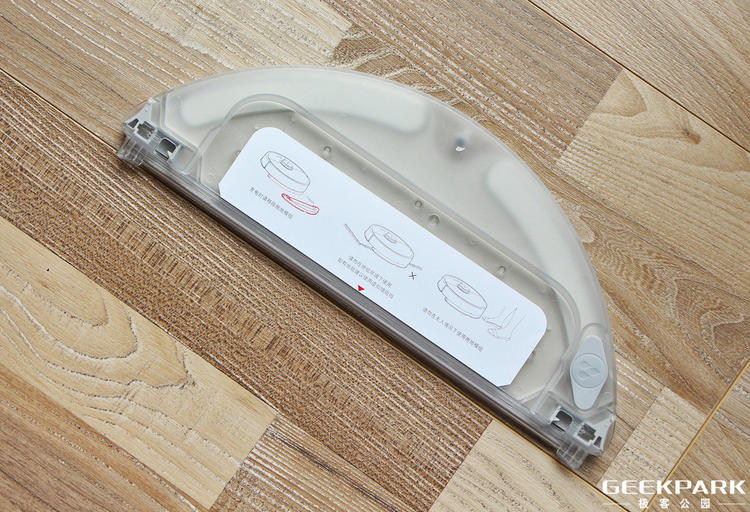 拖地作为去年产品发售以后大家最希望添加的功能,这一次是通过水箱模块实现的。它被设计成抽屉形状(如上图这样),右侧的水箱盖标识指导用户从此处灌水。如果你留意的话, 能看到两边各有一个卡扣,通过它可以安装到扫地机器人底部,整个过程就像把抽屉塞进桌子一样,非常简单。