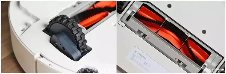 这一次的主轮悬挂系统(左),从原来的 1.5cm 提升到了 2.0cm,进一步优化了翻阅障碍的能力。而主刷部分的吸力相比前一代进一步提升,从去年 1800pa 升级到 2000pa,这也是在去年不少人的呼声之一,毕竟吸力提升能打扫的更干净,而在实际体验中,噪声比去年并没有特别明显变化。