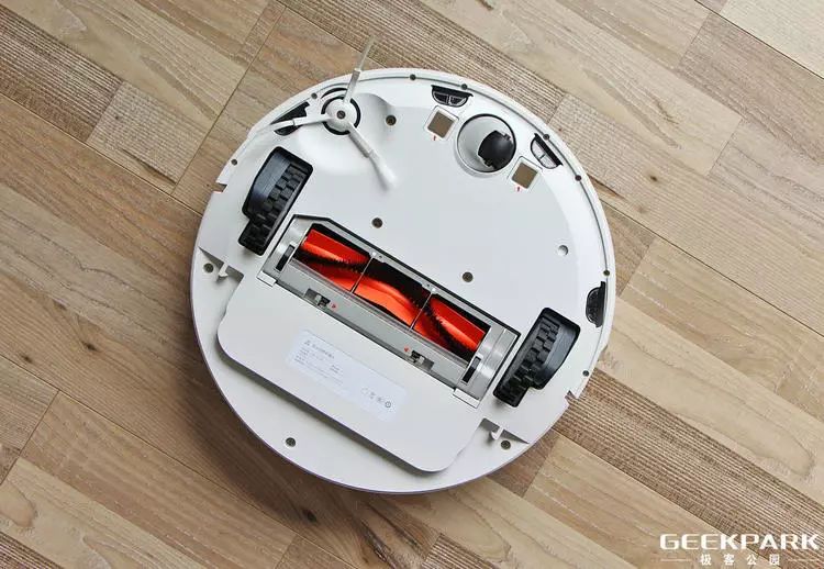 边刷和万向轮是前半部分的主要部件,主轮两侧的悬崖传感器(共 4 个,另外两个位于侧面)可以判断道路情况