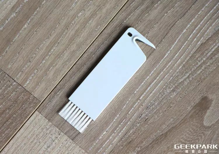 打开后盖能看到尘盒,以及 Wi-Fi 指示灯,尘盒是卡扣式设计,方便拆卸。尘盒左侧是附带的清理毛刷,更方便清洁滤网。尘盒容量方面,从去年的 0.42L 提升到 0.48L,意味着能清扫更多东西。