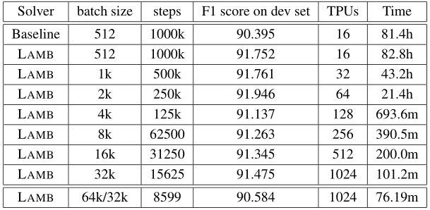 表 1:使用SQuAD-v1的F1 score作为精度指标。F1的基线成绩是由BERT的公共知识库提供的预训练模型(BERT-large)实现的 (截止到2019年2月1日)。本文在实验中使用TPUv3s。本文使用了与基线相同的设置:总epochs的前9/10使用序列长度128,最后 1/10使用序列长度512。所有的实验运行相同数量的epochs。Dev set表示测试数据。值得注意的是,本文可以通过手动调整超参数来获得更好的结果。