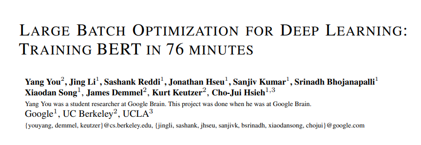 展示了LAMB在多个挑战性任务中的强大实证性能。使用LAMB,将训练BERT的批量大小扩展到32k以上,而不会降低性能;时间从3天减少到76分钟。这是目前将BERT训练经过时间减少到几个小时以内的第一项工作。