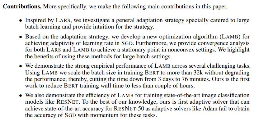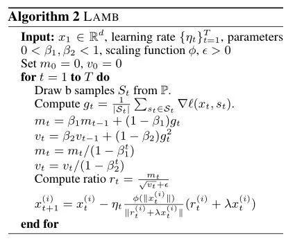 基于自适应策略,提出了一种新的优化算法(LAMB)来实现SGD中学习速率的自适应。此外,还提供了LARS和LAMB的收敛分析,以获得非凸情况下的一个驻点。我们将重点介绍在大型批处理设置中使用这些方法的好处。