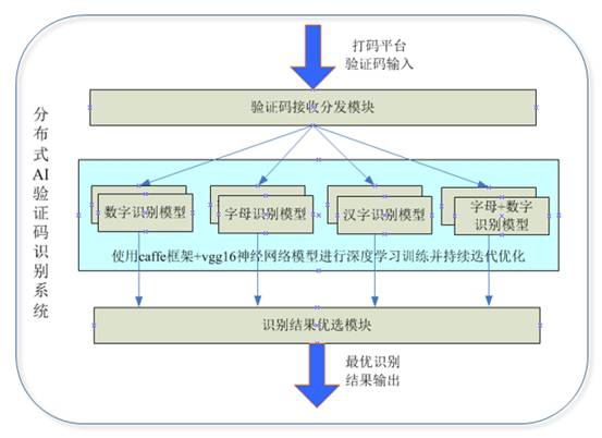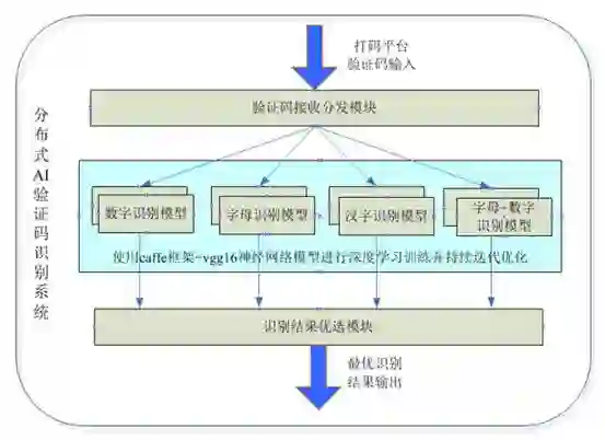 由于不同方式生成的验证码风格迥异,且经常变换,为了实现精准识别,提高准确度,“快啊答题”收集了大量不同风格的样本,并开发了验证码接收与分发模块,输入端对接打码平台,输出端根据验证码类型轮询选择并推送到相应的验证码识别模型,验证码识别完成,返回验证码字符串到打码平台,打码平台确认是否识别正确,并将结果反馈至该分布式AI验证码识别系统进行进一步优化。