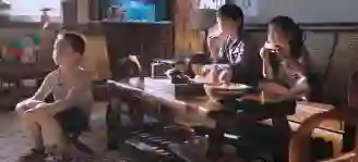三个孩子一起看电视,被收养的贺子秋还比较怯懦,独自坐在一旁,西瓜也不敢吃。