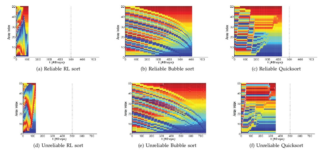 该论文主要针对软件开发领域问题。软件程序在开发中,通常并未考虑“韧性”(resiliency)和“稳定性”(stability),即程序是否可以从诸如内存芯片崩溃等一些开发中并未虑及的问题下存活。虽然软件开发的最佳实践一直在与时俱进,正如设计模式和正确性证明等,但是现有研究并未考虑到编程人员会出错误的问题,也没有考虑当失败条件或是错误出现时,程序运行过程中会表现出怎样的行为。由此,Faust 等人提出了引入机器人研究领域的方法去改进软件开发方法,采用“基于目标的任务”面对错误问题。为测试论文所提出的理论,论文研究者以数组排序为实际用例,实现了一种新的智能体。排序任务是计算机科学中的一个经典问题,可作为测试新软件方法的一个好任务。该程序称为 RL 排序算法,它使用强化学习的方法最大化回报,使用马尔科夫决策过程从变量空间的可能移动中做出选择。由此,排序程序的计算过程变成“在变量空间中的轨迹问题”。时间每推进一次,程序搜索“状态”和程序变量会发生相应的改变,进而发现用于正确排序数组元素的行动轨迹。论文进而对比测试了两种经典排序算法,即快排和冒泡排序。实验表明,在引入 5% 错误条件的情况下,虽然两种经典算法很快会出错,但论文提出的强化学习(RL)排序算法依然可以正确的执行。另一方面,在出现错误时,RL 排序算法给出的结果要更接近于完全正确排序的数组。此外,RL 排序算法在实现排序中操作的数组元素更少,因此性能也要优于其它两种对比方法。