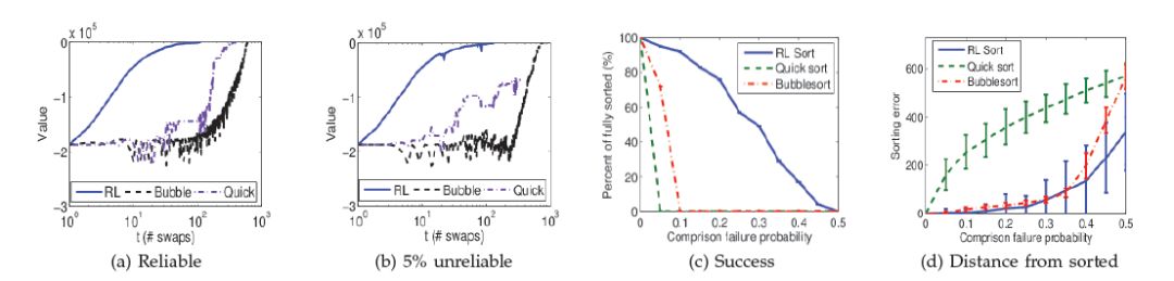 图 2c 和 2d 显示了算法韧性随错误率变化的情况。图 2c 对比显示了成功排序数组的比例随失败概率变化的情况。对于 5% 的失败率,快排完全不可能给出排序结果。冒泡排序在错误率高于 10% 时会完全失败。RL 排序在错误率 50% 以下时,都可能给出正确的排序。这验证了论文提出的理论结果。图 2d 给出了最终错误(即终止状态和排序数组间的欧氏距离)的均值和标准偏差,数值越低越好。RL 排序算法总是能保持最低。快排算法的错误则是一条凸曲线,意味着即便是最小的初始错误,都会导致最终结果存在很大的错误。总而言之,与这些经典排序算法相比,RL 排序算法更有可能实现正确的排序运算。即便产生错误,RL 排序算法给出的结果也是最接近于正确结果的。