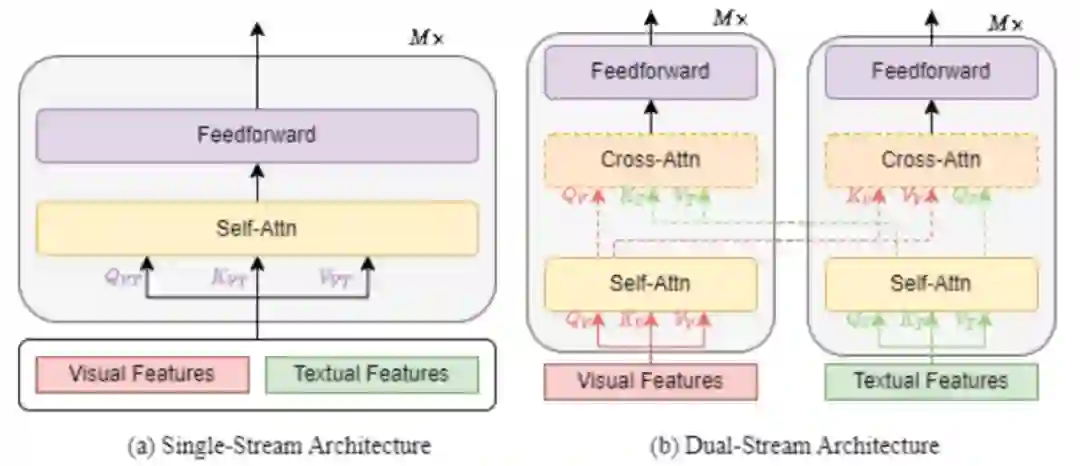 是指将文本和视觉特征组合在一起,然后馈入单个 transformer 块,如下图 1 (a) 所示。单流架构通过合并注意力来融合多模态输入。单流架构的参数效率更高,因为两种模式都使用相同的参数集。