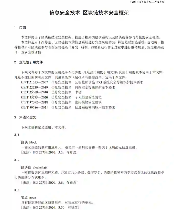 《信息安全技术区块链技术安全框架》国家标准,本标准本文件提出了区块链技术安全框架,描述了框架的层次结构以及区块链各参与角色的安全视图。本文件适用于指导基于区块链技术的信息系统进行安全风险防范,特别是联盟链系统,也适用于指导指导所有区块链参与者在区块链设计开发、研制、部署和运行的全过程中进行整体规划、安全框架设计、及安全性评估。