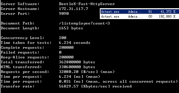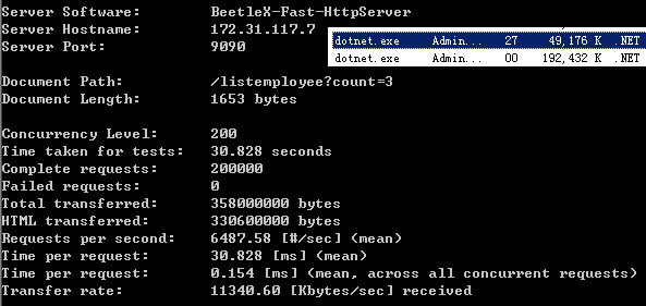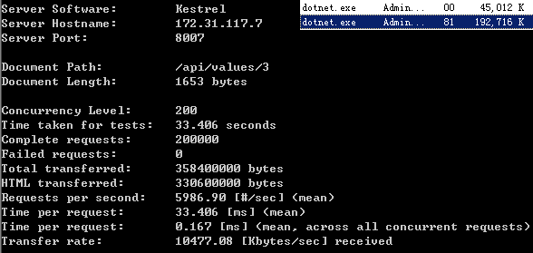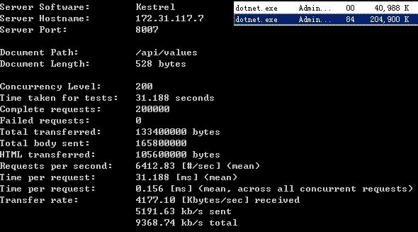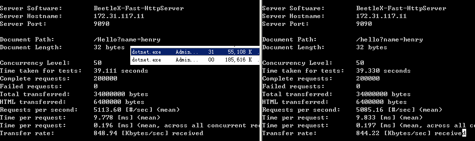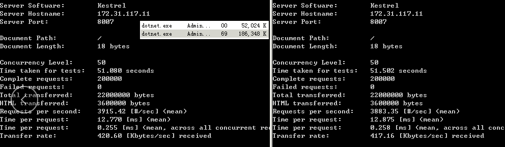 对比一下两者在accept connection上的性能差异,开启了两个AB实例同时进行压测,结果是FastHttpApi在处理并发数快高于Kestrel快一倍的情况,CPU使用率只有Kestrel的一半。