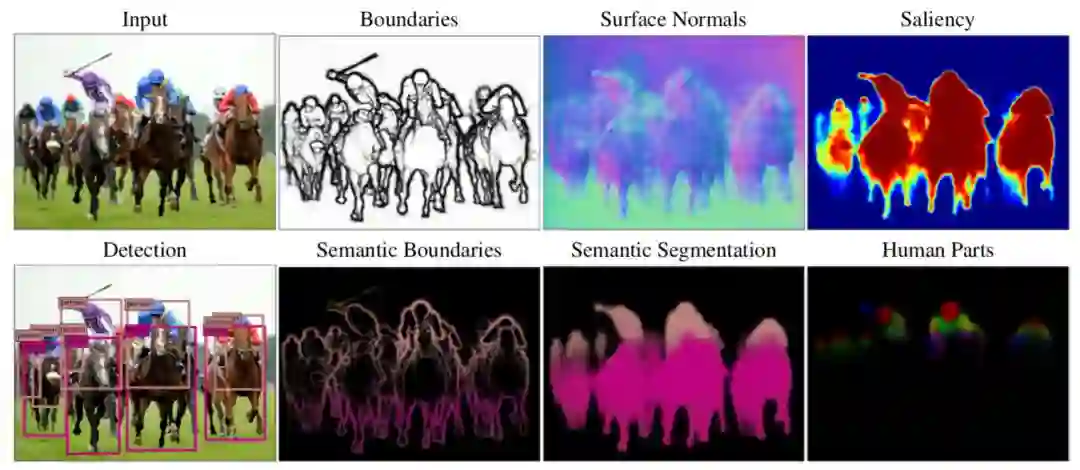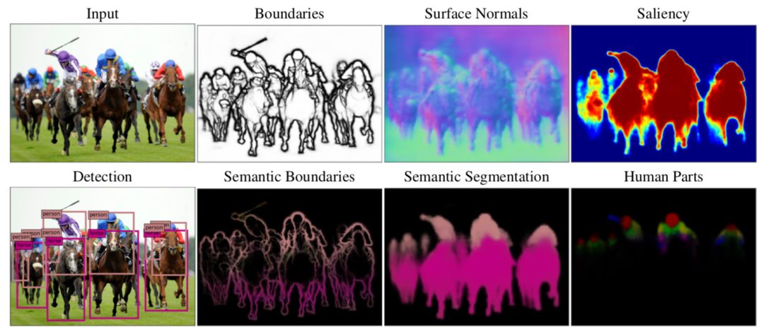 图 1: Deep Nets 能够执行各种各样的视觉任务。包括:边界检测、语义分割、语义边界、曲面法线、显著性、人体部位和对象检测。(来源: https://arxiv.org/abs/1609.02132)
