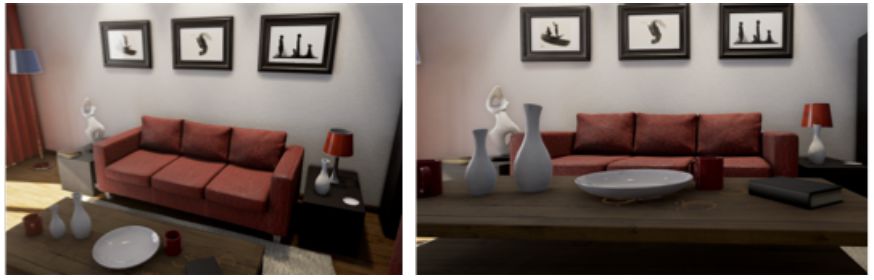 图 2:UnrealCV 让视觉研究人员能够轻松地操纵合成场景,例如改变沙发的视角。我们发现 Faster-RCNN 检测沙发的平均精度 (AP) 在 0.1 到 1.0 之间,对视角的敏感度极高。这可能是因为训练中的偏见导致 Faster-RCNN 偏向于特定的视角。