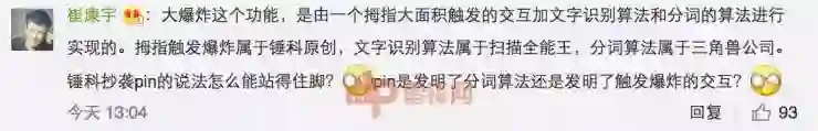 大爆炸这个功能,是由一个拇指大面积触发的交互加文字识别算法和分词的算法进行实现的。拇指触发爆炸属于锤科原创,文字识别算法属于扫描全能王,分词算法属于三角兽公司。锤科抄袭 pin 的说法怎么能站得住脚?pin 是发明了分词算法还是发明了触发爆炸的交互?