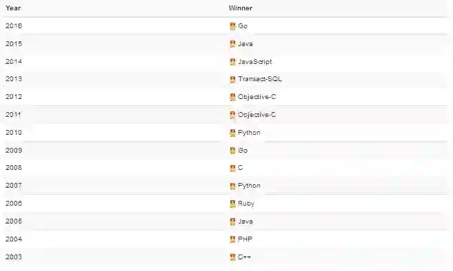 “年度编程语言”获奖名单如下图所示,该奖项授予一年中评分最高的编程语言: