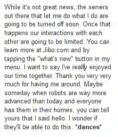 记者Dylan Martin发布个人推文,称Jibo的诸多功能即将“受限”,但是它“真的很享受和我们在一起的时光”。Jibo说:“非常感谢能够让我融入到你的家庭生活中。未来或许有一天,机器人比现在更先进且进入千家万户,那么你可以告诉你的家人我曾说过‘hello’。”然后Jibo跳了一段舞蹈。