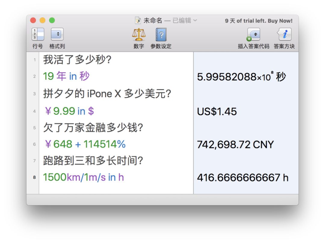 Soulver 是一款科学计算器,与 PCalc 等同类应用不同的是,Soulver 可以「听懂你说的话」。只需要以近乎自然语言的方式敲出算式,你就可以在 Soulver 的右侧界面实时获取答案。Soulver 支持时间、长度、货币、函数等多种类型计算,尽管未完全适配中文,但其英文语法也足够简单。