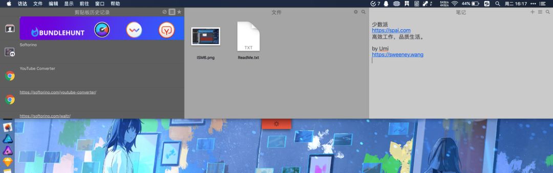 Unclutter 同样看上了 macOS 菜单栏这块风水宝地。它允许你通过简单的下拉手势召唤操作界面,管理剪贴板、暂存文件、撰写笔记等,用一个应用替代 Paste、Yoink、Ghostnote 等众多竞品。
