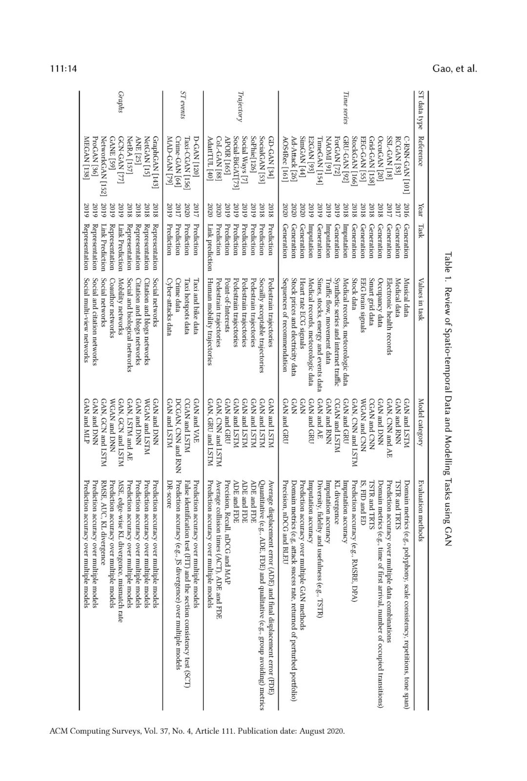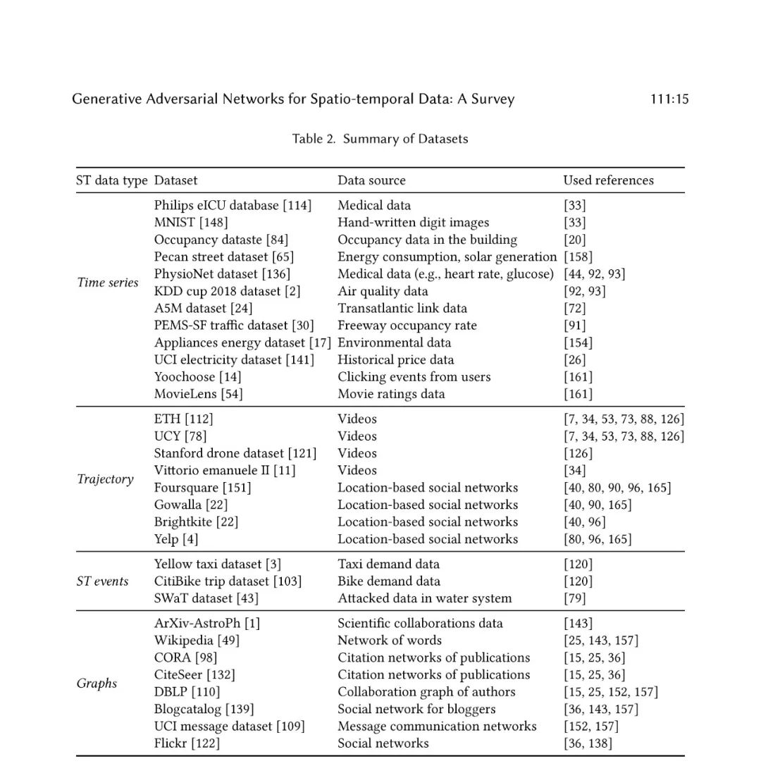 一些研究回顾了最近关于ST数据或GAN在不同领域的应用问题的文献。与从传统关系数据挖掘模式相比,建模ST数据特别具有挑战性,因为除了实际测量之外,它还具有空间和时间属性。Atluri等人(atluri2018spatio)回顾了ST数据建模的流行问题和方法。提供了不同类型ST数据的分类、定义和描述数据实例的方法,以确定实际应用程序中任何类型ST数据的相关问题。他们还列出了通常研究的ST问题,并回顾了处理不同ST类型的独特属性的问题。Want等人(wang2019deep)回顾了将深度学习应用于ST数据挖掘任务的最新进展,并提出了一个利用深度学习模型解决ST数据建模问题的流程。Hong等人(hong2019生成)从不同的角度解释了GANs,并列举了常用的用于多任务的GAN变体。在(pan2019recent)中讨论了GANs的最新进展,Wang et al. (wang2019生)提出了一种用于计算机视觉领域的GANs分类。特别是,Yi等人(yi2019生)回顾了GANs在医学成像中的最新进展。