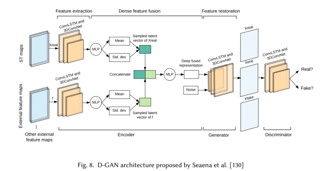 然而,直接使用图像或视频生成并不适用于ST数据的建模,如交通流、区域降雨和行人轨迹。一方面,图像生成通常考虑输入和输出图像之间的外观,不能充分处理空间变化。另一方面,视频生成考虑了图像间的空间动态,但是,当对下一幅图像的预测高度依赖于前一幅图像时,时间变化没有得到充分考虑(saxena2019d)。因此,将GANs成功应用于ST数据需要探索新的方法。