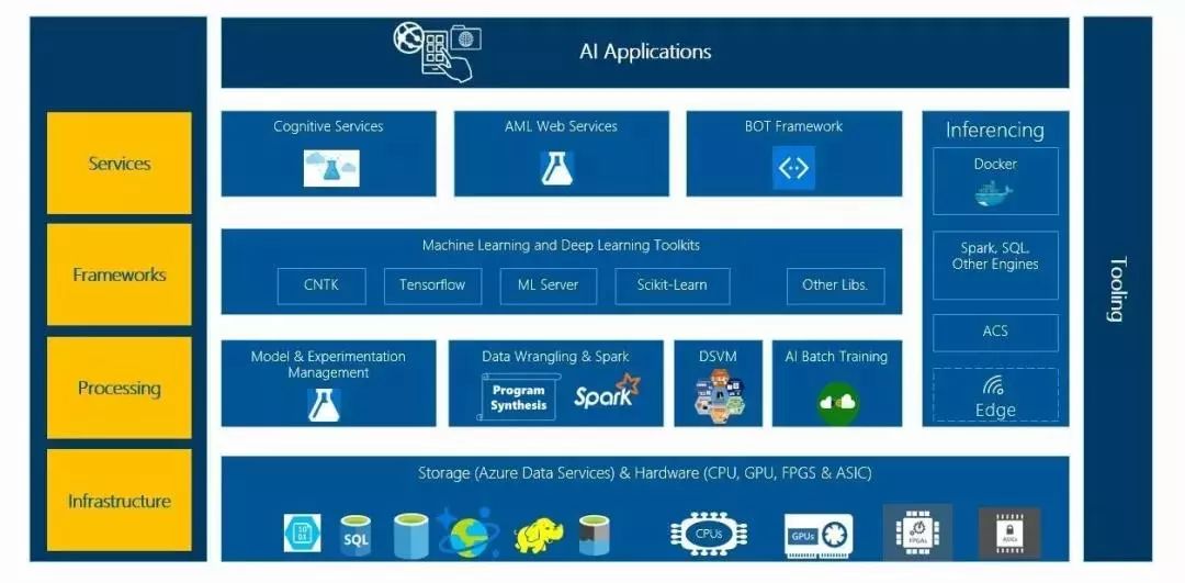 三,AI 算法。提供成熟的 AI 算法供应用开发者使用,例如让微软认知工具包 CNTK 与 TensorFlow、Caffe 等框架实现灵活转换,在一种框架下训练好的模型,可以在另一种框架下无缝使用,并将更多算法集成到 Visual Studio 中去。