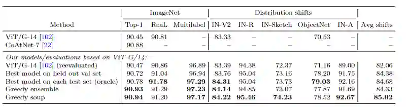 贪婪汤比ViT-G/14在JFT-3B上预训练并在ImageNet上微调后得到的最好的单个模型在分布内和分布外的情况下的性能都有所提升。