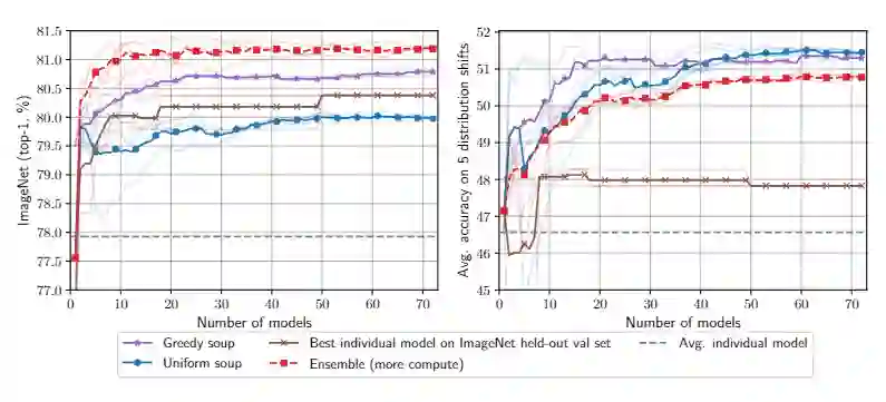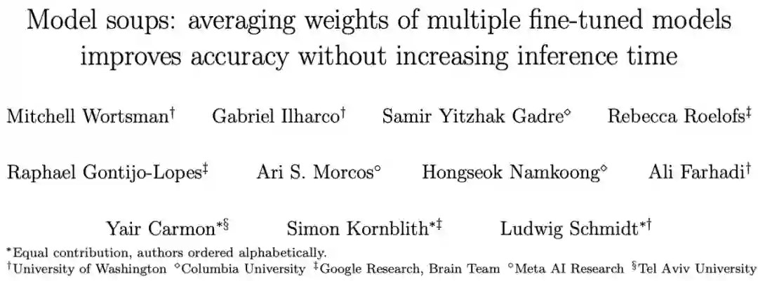 Google提出将多个微调后的模型进行权重平均化,而非选择在验证集上达到最高精度的单个模型,最终产生的新模型就称为模型汤。