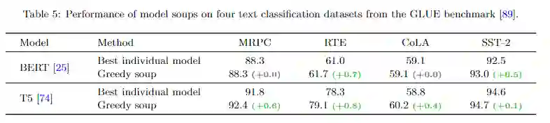为了测试通过模型汤获得的模型性能提升是否可以扩展到图像分类以外的领域,研究人员还对NLP任务进行了实验。研究人员在四个文本分类任务上对BERT和T5模型进行了微调,这些任务来自于GLUE基准:MRPC,RTE,CoLA和SST-2。实验结果虽然改进没有图像分类中那么明显,但贪婪汤在许多情况下可以比最好的单模型性能更好。