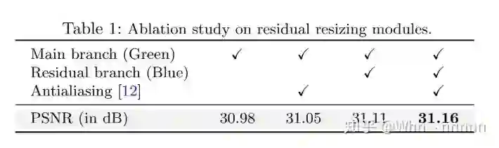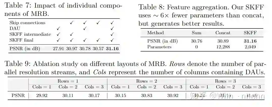 由于投稿篇幅的限制,有一部分消融实验(Ablation studies)的数据被放在了补充材料中,这部分,作者主要验证了使用的Skip connections、DAU、SKFF、residual resizing modules等模块的必要性,对性能的提升,以及内部结构的选择,在这里主要选取一部分结果图即可。