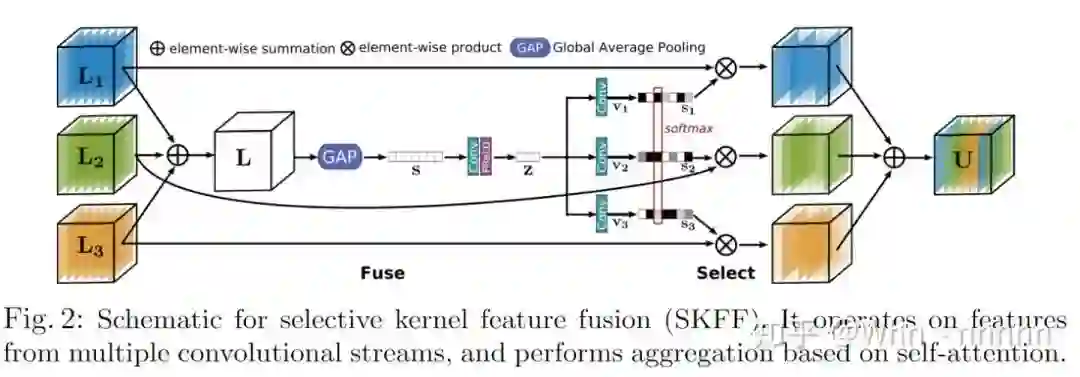 (1)Fuse:从三个并行卷积流接收输入,首先按元素求和的方式将多尺度特征组合在一起: ,在