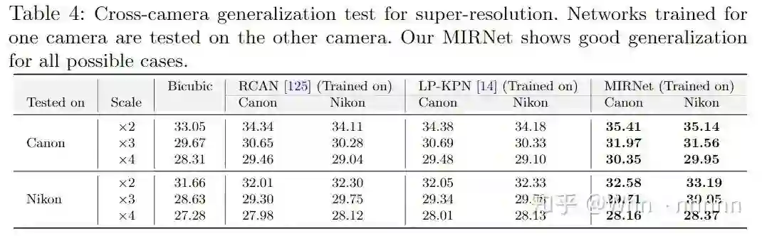 By the way,由于文章略长,MIRNet在去噪,超分,增强方面均可以应用,对比数据较多,所以这里只截取了一部分图片,可以在文章中和Supplementary中找到更详细的结果对比。此外,文章中在三个应用领域部分分别提及了模型的泛化能力(generalization),这里也只做一个综述:去噪方面,SIDD和DND数据集中的图片有着不同特征的噪声,而训练时仅使用SIDD训练集,模型在SIDD和DND测试集上均表现良好,证明了MIRNet良好的泛化能力;超分辨率方面,使用Canon和Nikon两种相机的图片进行了一个交叉实验,验证了MIRNet的泛化能力较强。