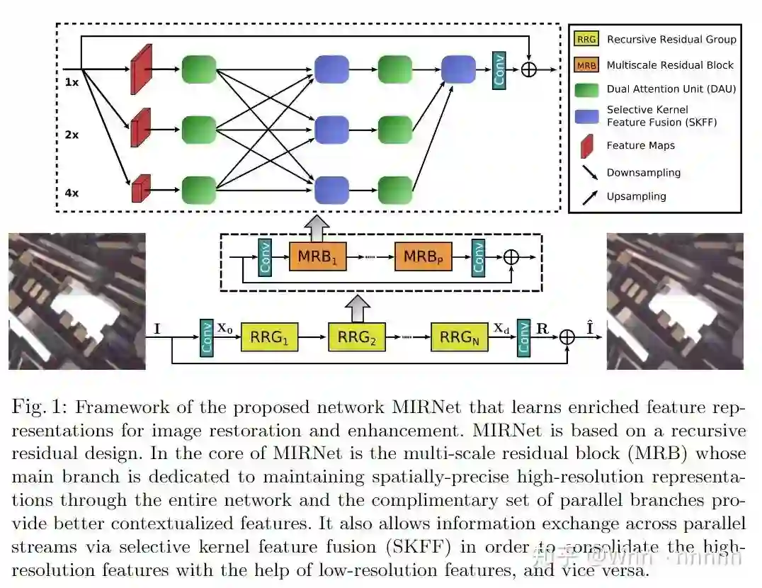 以从低分辨率(退化)图像中恢复出高质量图像内容为目标,图像恢复(Image Restoration)已经在众多领域得到广泛应用。现有的基于CNN的方法通常在全分辨率(full-resolution)或渐进式低分辨率(progressively low-resolution)上进行:在full-resolution下虽然得到了良好的空间精确度(spatially precise),但是不能获得鲁棒性较好的上下文信息(context);而在progressively low-resolution下,虽然在语义上可靠(semantically reliable)/得到好的上下文信息,但是在空间上并不太准确。那么在本文中,提出了一种新颖的结构,可以通过神经网络保持空间上精确的高分辨率表示;并从低分辨率表示中获取良好的上下文信息(strong contextual information)。网络的核心是包含几个关键元素的多尺度残差块(multi-scale residual block):(a)用于提取多尺度特征的并行多分辨率卷积流(parallel multi-resolution convolution streams);(b)跨多分辨率流的信息交换;(c)用于捕捉上下文信息的空间和通道注意机制(spatial and channel attention mechanisms);(d)基于注意机制的多尺度特征聚合(aggregation)。简言之,MIRNet学习丰富的特征,结合了多个尺度的上下文信息的同时保持了高分辨率的细节,在图像去噪、超分辨率、图像增强任务上取得了极好的效果。