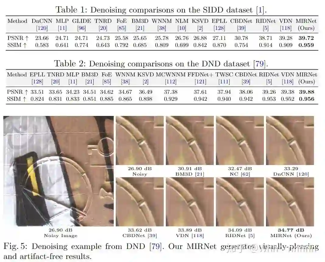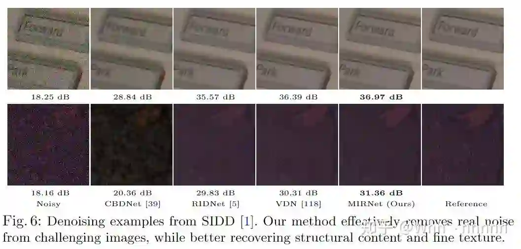不难看出,MIRNet的确表现优异,在PSNR、SSIM数值上和视觉效果上,超过了RIDNet、VDN等算法,达到SOTA级别的效果。