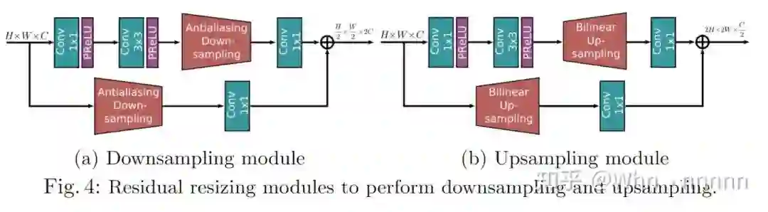 在MRB中,特征图的大小沿卷积流保持不变,而跨流方向,特征图的大小根据输入分辨率索引和输出分辨率索引进行变化(下采样或上采样),执行2倍下采样则将上图中的下采样模块应用一次,对于4倍下采样,则将该模块连续使用两次,上采样也是类似的操作。在上图中,作者集成了抗混叠下采样(anti-aliasing downsampling)来改善平移方差(shift-equivariance)。