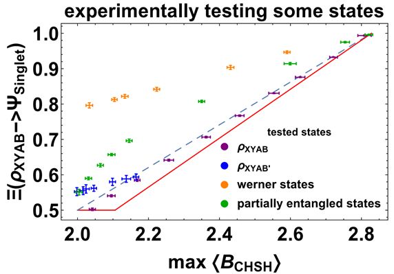 对于两体两维纠缠态来说,贝尔不等式的最大违背可以达到2根号2。一个逆向思维理论就是,如果在贝尔不等式实验中观察到2根号2的违背,可以认为测试的量子态就是最大纠缠态的等价形式,这被称为纠缠态的自检验。更重要的是,贝尔不等式的检验无需精确知道双方测量设备的测量基,只需任意改变设置获得经典的关联概率。将这种理论用于实际纠缠态自检验的一个关键问题是,当观察到的贝尔不等式违背值小于2根号2时,观察者对未知态的纠缠特性可以做出什么样的描述。这种描述可以定量为相对于最大纠缠态的保真度的最低可能值,即以观察到的实际违背值为自变量的保真度下限。这个下限越优,可以给出的保真度越高,也就具有更好的鲁棒性。