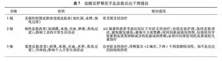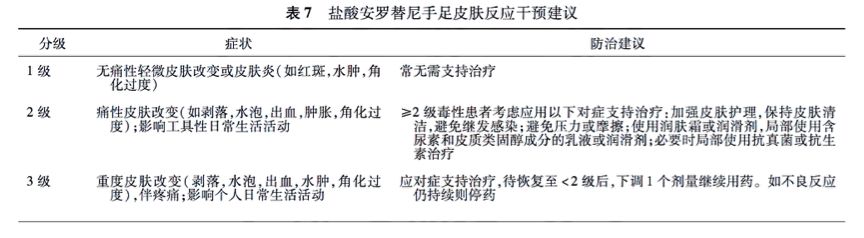 2. 手足皮肤反应防治建议:需根据其严重程度采用支持治疗或其他治疗措施积极对症治疗,见下表。
