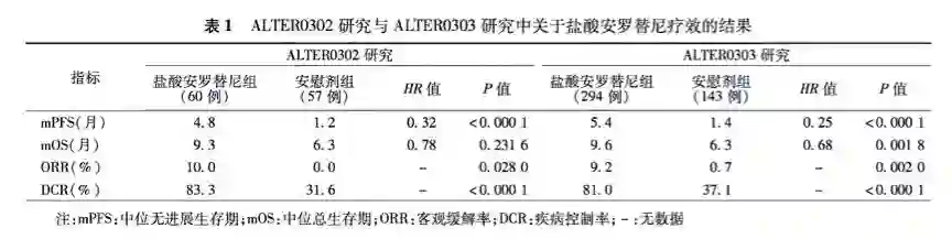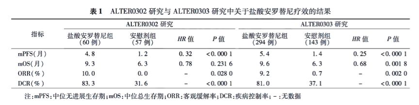 II期临床研究ALTER 0302和III期临床研究ALTER0303结果均显示,与安慰剂相比,盐酸安罗替尼单药用于晚期NSCLC患者三线及以上治疗,患者的临床获益显著。在ALTER0303研究中,与安慰剂组相比,盐酸安罗替尼显著延长患者的PFS达4.0个月(HR =0.25;P<0.0001),显著延长OS达3.3个月(HR =0.68;P=0.001)。