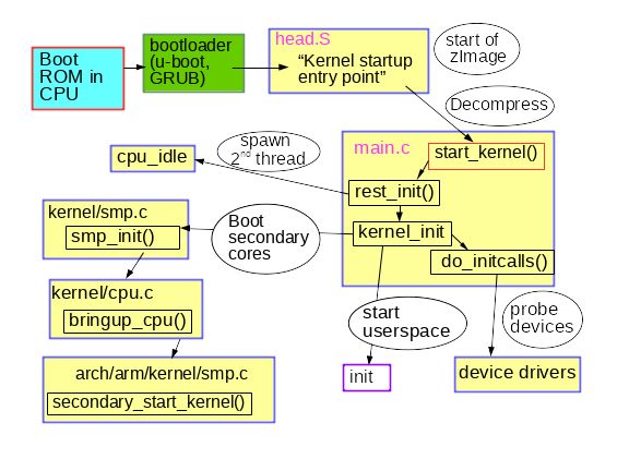 用 GDB 检查内核的启动给出了答案。首先安装内核的调试软件包,内核中包含一个未剥离的unstripped vmlinux,例如 apt-get install linux-image-amd64-dbg,或者从源代码编译和安装你自己的内核,可以参照 Debian Kernel Handbook 中的指令。gdb vmlinux 后加 info files 可显示 ELF 段 init.text。在 init.text 中用 l *(address) 列出程序执行的开头,其中 address 是 init.text 的十六进制开头。用 GDB 可以看到 x86_64 内核从内核文件 arch/x86/kernel/head_64.S 开始启动,在这个文件中我们找到了汇编函数 start_cpu0(),以及一段明确的代码显示在调用 x86_64 start_kernel() 函数之前创建了堆栈并解压了 zImage。ARM 32 位内核也有类似的文件 arch/arm/kernel/head.S。start_kernel() 不针对特定的体系结构,所以这个函数驻留在内核的 init/main.c 中。start_kernel() 可以说是 Linux 真正的 main() 函数。