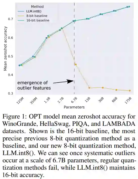 该研究为 transformer 提出了首个数十亿规模的 Int8 量化过程,该过程不会影响模型的推理性能。它可以加载一个具有 16-bit 或 32-bit 权重的 175B 参数的 transformer,并将前馈和注意力投影层转换为 8-bit。其将推理所需的内存减少了一半,同时保持了全精度性能。