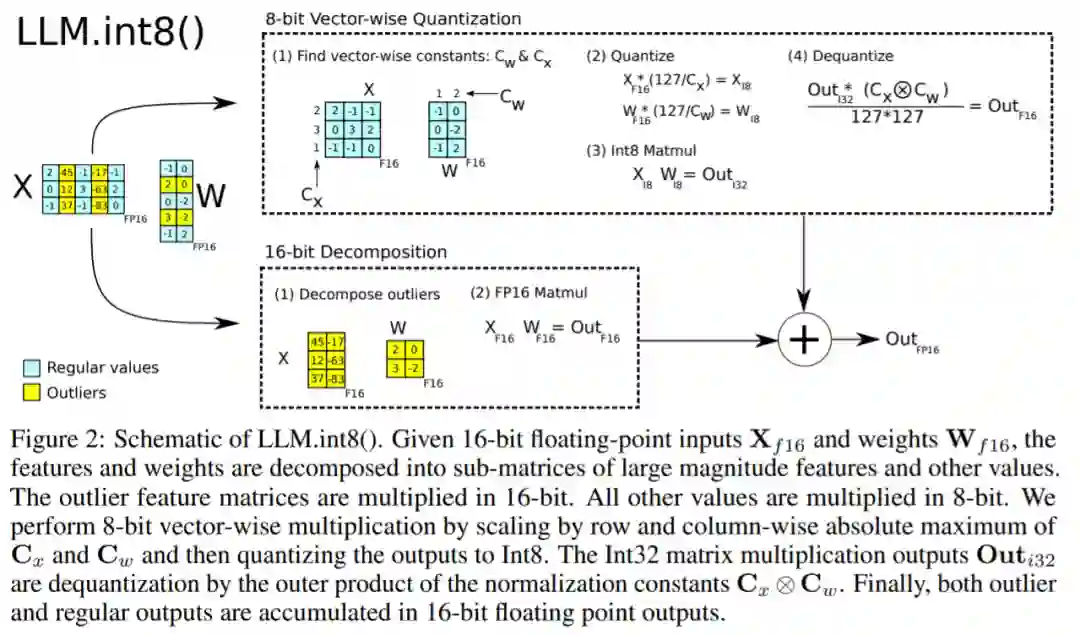 LLM.int8()算法可以这样解释,本质上,LLM.int8()试图通过三个步骤来完成矩阵乘法计算: