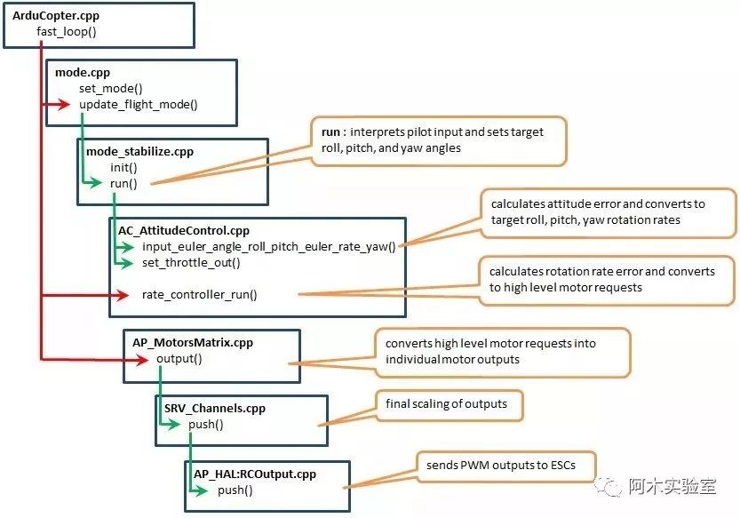 在对这些函数进行任何调用之后,调用 AC_AttitudeControl:: rate_controller_run() 。这将上述方法的输出转换为 通过它的set_roll,set_pitch,set_yaw和set_throttle 方法发送到AP_Motors库的滚动,俯仰和偏航输入 。