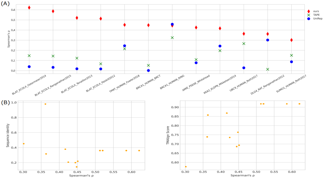 同时还可以注意到,该方法的性能与 DMS 测试蛋白和训练蛋白间的结构相似性相关,但与 DMS 测试蛋白和训练蛋白间的序列相似性无关。这进一步证实了零样本突变效应预测是使用了结构信息的。