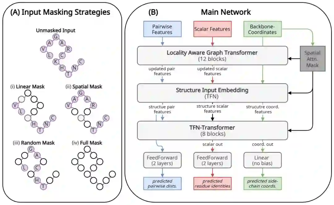 该架构由两个主要的子模块组成:12 层 Locality Aware Graph Transformer 和 8 层 TFN-Transformer。其中,Locality Aware Graph transformer利用蛋白质主干的几何形状来优化单个残基和残基对的特征表示,并将注意力限制在空间上相邻的残基对。该模块的输出和蛋白质主干坐标一起被传递到下一个模块 TFN transformer,该模块为每个输入残基产生侧链构象和氨基酸类型。这些模块的详细信息在许教授另一篇文献中有完整描述,下面给出了示意图。