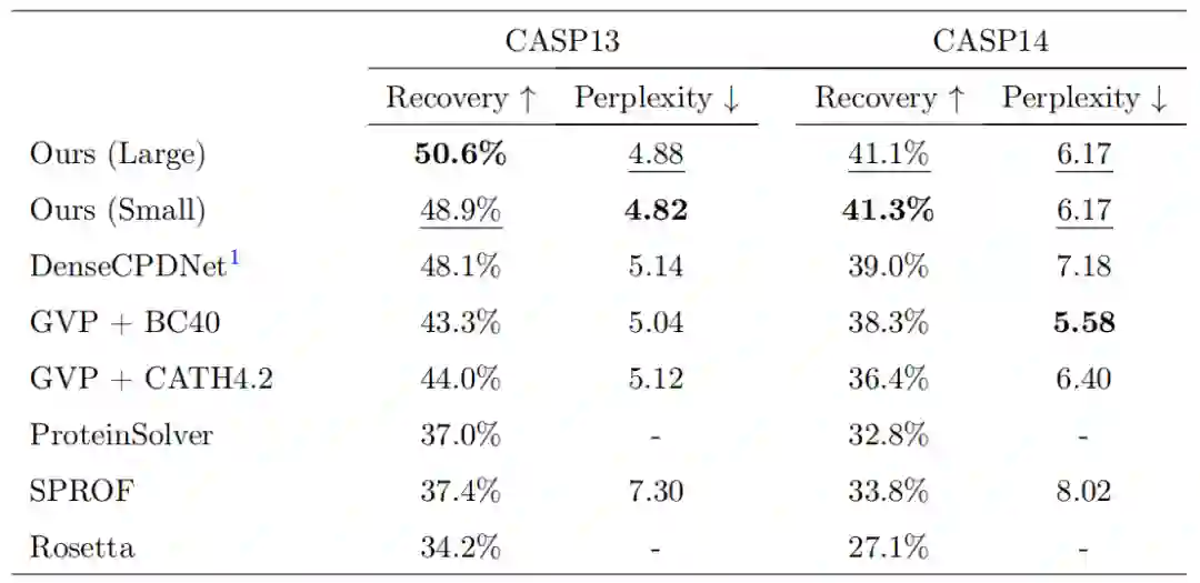 研究人员在四个测试集( CASP13、CASP14、CATH4.2 和 TS50)上比较了几种现有的逆向折叠方法,表明新方法在所有数据集上具有明显更高的天然序列恢复率(NSR)。